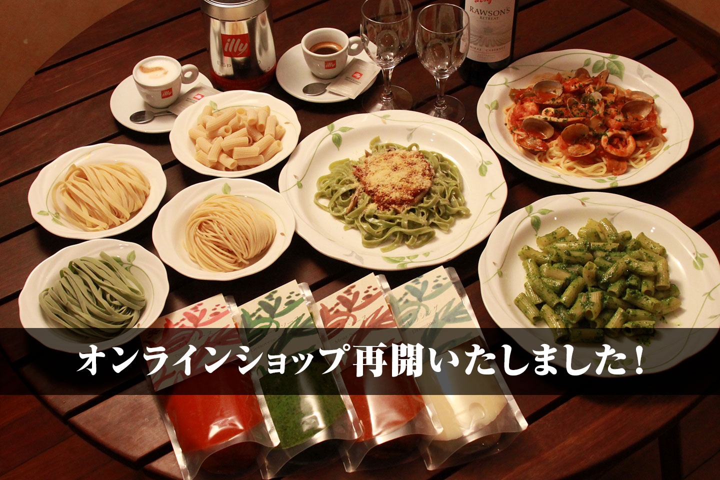 生のパスタと出来上がったソース、粉チーズ、お薬味等を別々にお持ち帰り頂き、ご自宅で生パスタを茹でて、すでに完成しているソースを電子レンジで温めてかける、または和えるだけ。